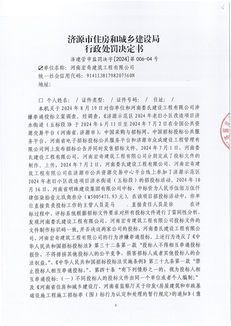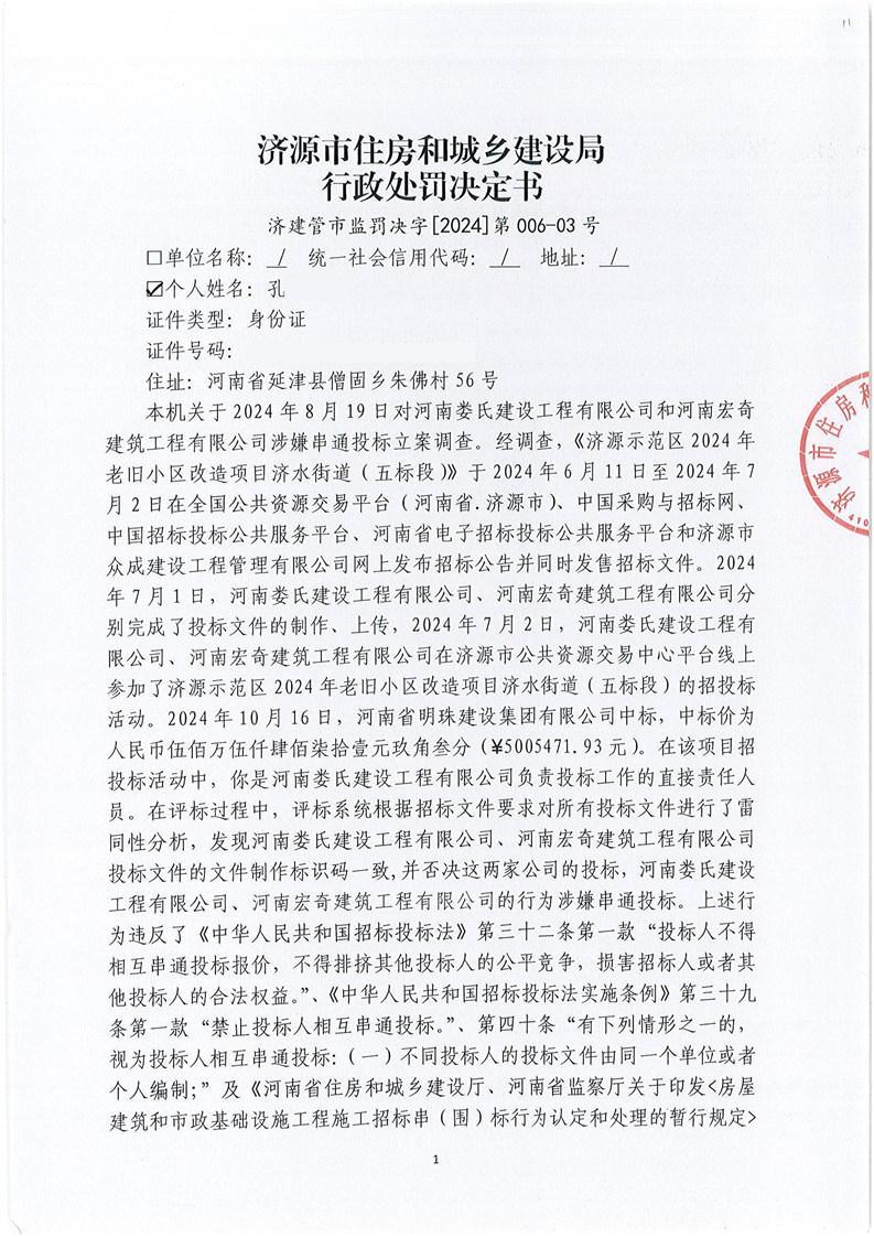 济源市住房和城乡建设局行政处罚决定书济建管市监罚决字(2024)第006—01号